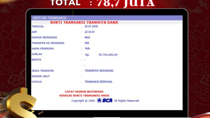 NAGA303 mengucapkan selamat kepada user id : YAN*** yang telah berhasil mendapatkan jackpot pada permainan LIVE CASINO DI BACCARAT. Kemenangan sebesar Rp 78.750.000,-. telah dibayarkan LUNAS oleh pihak naga303 kepada pemilik user id setelah yang bersangkutan mengisi formulir withdraw. Proses pencairan dana berlangsung sangat cepat hanya dalam waktu 6-11 menit sudah berada dalam rekening pemilik user id. Bukti transfer yang dapat anda lihat adalah bukti SAH / VALID yang langsung di dapatkan melalui bukti transaksi dari Bank yang digunakan untuk pengiriman dana pada rekening pemilik user id. Terima kasih kami sampaikan kepada para pengguna setia naga303 yang telah menggunakan situs kami, sebagai Bandar Terpercaya yang pastinya membayar semua kemenangan member hingga lunas. Apakah Naga303 PENIPU ? Reputasi “NAGA303 TERPERCAYA” sudah sangat melekat. puluhan hingga ratusan ribu pengguna setia NAGA303 tetap menggunakan situs terbesar dan terbaik di Indonesia ini. Hapus rasa was-was dan khawatir anda, kemenangan anda berapapun PASTI dibayarkan hingga lunas.