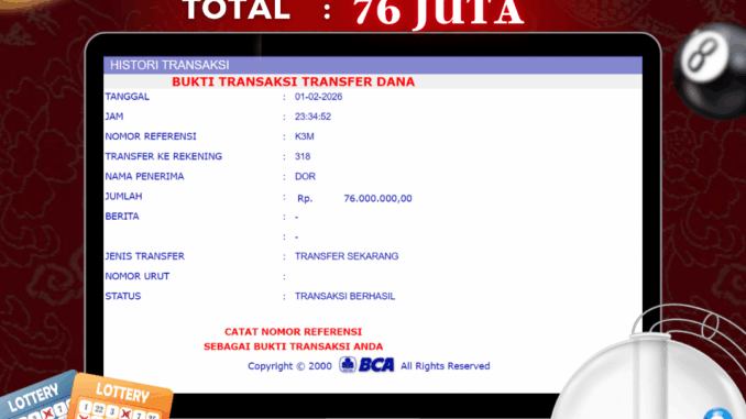 NAGA303 mengucapkan selamat kepada user id : REV*** yang telah berhasil mendapatkan jackpot pada permainan TOGEL DI KINGKONG 4D. Kemenangan sebesar Rp 76.000.000,-. telah dibayarkan LUNAS oleh pihak naga303 kepada pemilik user id setelah yang bersangkutan mengisi formulir withdraw. Proses pencairan dana berlangsung sangat cepat hanya dalam waktu 6-11 menit sudah berada dalam rekening pemilik user id. Bukti transfer yang dapat anda lihat adalah bukti SAH / VALID yang langsung di dapatkan melalui bukti transaksi dari Bank yang digunakan untuk pengiriman dana pada rekening pemilik user id. Terima kasih kami sampaikan kepada para pengguna setia naga303 yang telah menggunakan situs kami, sebagai Bandar Terpercaya yang pastinya membayar semua kemenangan member hingga lunas. Apakah Naga303 PENIPU ? Reputasi “NAGA303 TERPERCAYA” sudah sangat melekat. puluhan hingga ratusan ribu pengguna setia NAGA303 tetap menggunakan situs terbesar dan terbaik di Indonesia ini. Hapus rasa was-was dan khawatir anda, kemenangan anda berapapun PASTI dibayarkan hingga lunas.