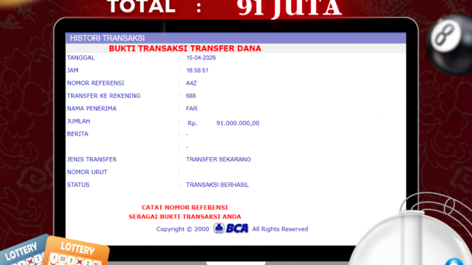 NAGA303 mengucapkan selamat kepada user id : UUN*** yang telah berhasil mendapatkan jackpot pada permainan TOGEL di SHIO AYAM. Kemenangan sebesar Rp 93.250.000,-. telah dibayarkan LUNAS oleh pihak naga303 kepada pemilik user id setelah yang bersangkutan mengisi formulir withdraw. Proses pencairan dana berlangsung sangat cepat hanya dalam waktu 6-11 menit sudah berada dalam rekening pemilik user id. Bukti transfer yang dapat anda lihat adalah bukti SAH / VALID yang langsung di dapatkan melalui bukti transaksi dari Bank yang digunakan untuk pengiriman dana pada rekening pemilik user id. Terima kasih kami sampaikan kepada para pengguna setia naga303 yang telah menggunakan situs kami, sebagai Bandar Terpercaya yang pastinya membayar semua kemenangan member hingga lunas. Apakah Naga303 PENIPU ? Reputasi “NAGA303 TERPERCAYA” sudah sangat melekat. puluhan hingga ratusan ribu pengguna setia NAGA303 tetap menggunakan situs terbesar dan terbaik di Indonesia ini. Hapus rasa was-was dan khawatir anda, kemenangan anda berapapun PASTI dibayarkan hingga lunas.